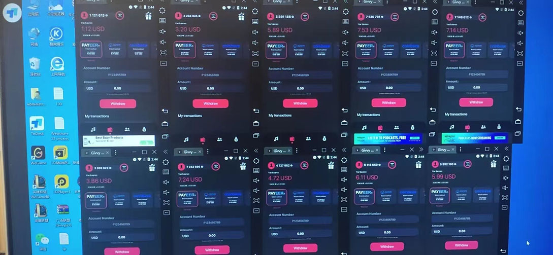 收益原理:通过脚本自动挂机看视频赚取金币,再用金币去换取美金,号称每天一个窗口在4–6美金的样子,目前美金换算人民币是16左右,也就是一个窗口一天有34块钱左右的一个收益,一台电脑最低10窗口起步也就是60美金起步(人民币360左右),说白了就是赚国外的一个汇率差。